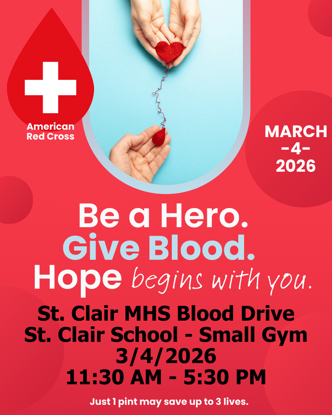 The MHS will be holding its annual Blood Drive at St. Clair School in the small gym on Wednesday, March 4, from 11:30 a.m. – 5:30 p.m.